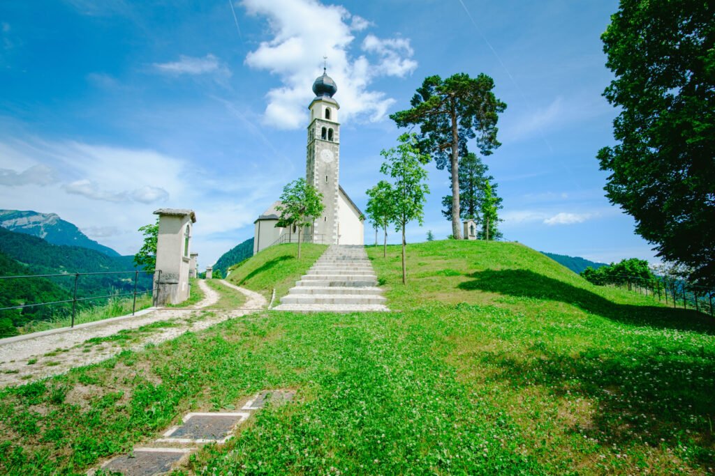 Uno degli elementi più affascinanti della chiesa è il suo campanile in stile romantico, sormontato da una caratteristica cupola a cipolla, che si staglia elegante nel paesaggio. Questo elemento architettonico, insieme alla narrazione legata a Giorgio Castelrotto, che trovò rifugio qui durante tempi difficili, contribuisce a rendere la visita ancora più ricca e significativa. Ogni pietra, ogni dettaglio architettonico racconta una storia, offrendo uno sguardo prezioso sulla cultura e le vicende del Tesino.